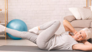 Sporty senior woman doing abs exercise on floor at home